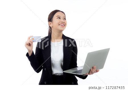 Portrait young asian businesswoman holding credit card and laptop for shopping online.