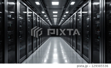 Futuristic Data Center Corridor with Rows of Server Racks and Bright LED Ceiling Lights