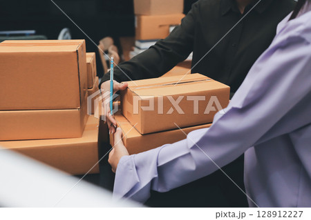 Portrait of Starting small businesses SME owners, two Asian woman check online orders Selling products working with boxs freelance work at home office, sme business online small medium enterprise