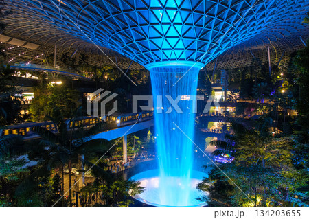 新加坡樟宜國際機場星耀樟宜綜合體內的人工瀑布「雨漩渦」的夜景
