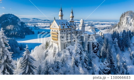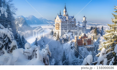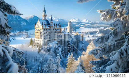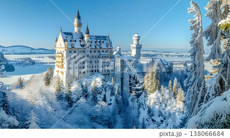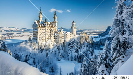 新天鵝堡被白雪覆蓋,呈現出夢幻般的冬季景象。