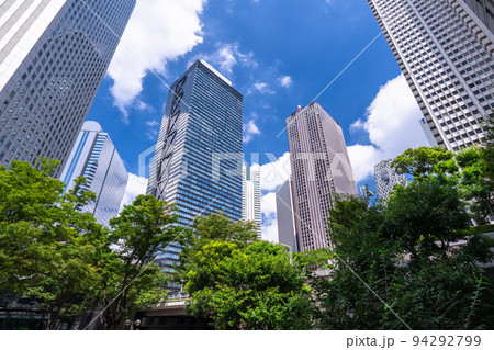 「東京」西新宿綠樹環繞的建築物景觀,新宿區