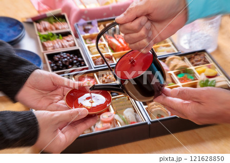 父母與孩子以時令菜餚倒年酒的場景