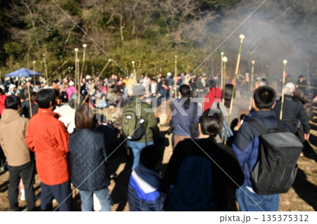 一幅水彩插圖,描繪了 1 月份舉行的當地活動 Dondoyaki(左義町,Tondo)燃燒的場景。