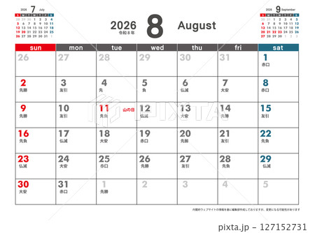 週日開始桌曆令和2026年8月8日3個月顯示六曜簡易日曆材料
