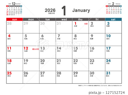 週日開始桌曆令和2026年1月8日3個月顯示六曜簡易日曆材料