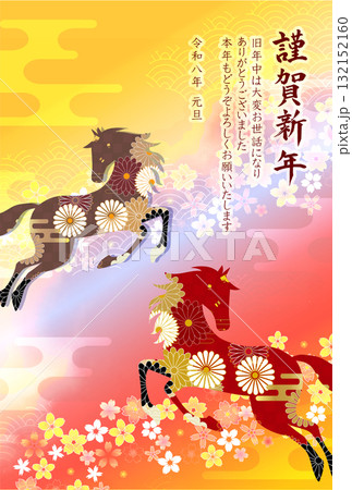 2026 匹馬年:一款色彩鮮豔的新年賀卡模板,以可愛的駿馬和吉祥物品為主題。附贈新年賀卡結尾的祝福語。