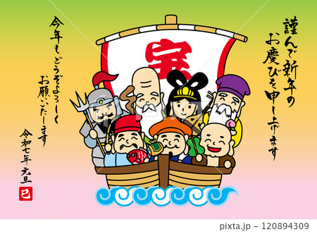 2025蛇年新年賀卡模板,手繪日式插畫寶船上七福神