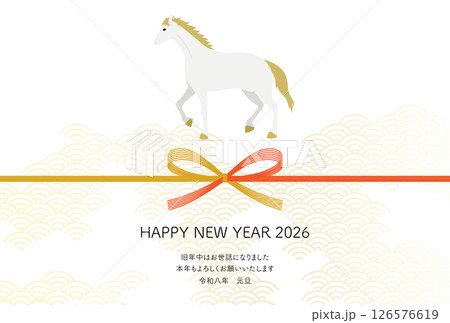 2026 年馬年的簡單新年賀卡,背景為日本圖案的白馬和水引