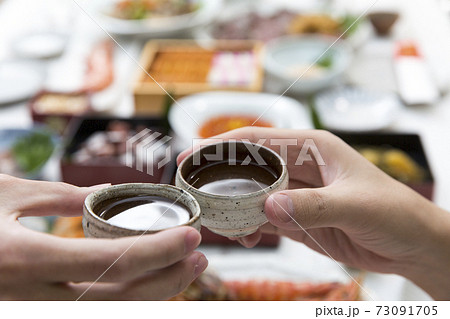 在各種清酒容器中飲用清酒、純米大吟釀、燻清酒和冷清酒[享受酒精的圖像]