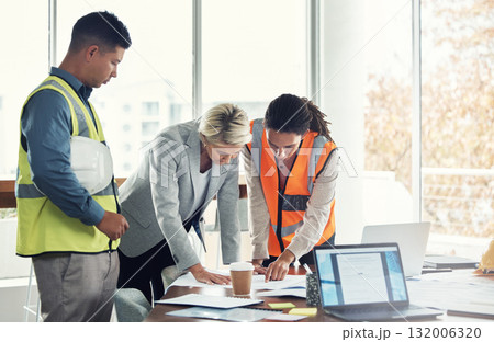 Architecture, collaboration and planning with people and blueprint in office for construction, design and building. Teamwork, review and meeting with group for project management, goal or engineering