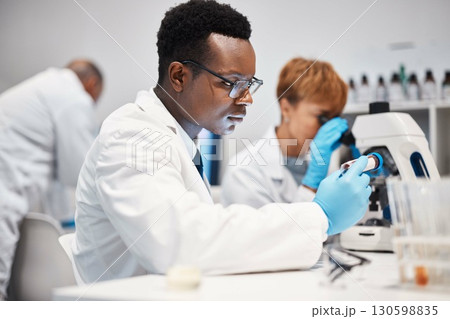 Science, vial and black man with focus, laboratory and innovation for healthcare, wellness and vaccine. Research, Nigerian male employee and researcher with test tube, experiment or medicine for cure