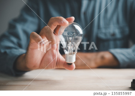 A hand holds a lightbulb over a wooden table, symbolizing new ideas and innovation.