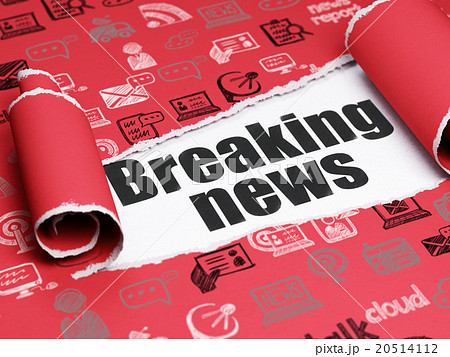 Wide picture of blurred newspapers on the table with the red inscription BREAKING NEWS in the middle on white paper