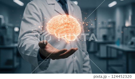 Doctor holding a glowing brain hologram. Concept for neurological research, mental health, artificial intelligence, and cognitive science.