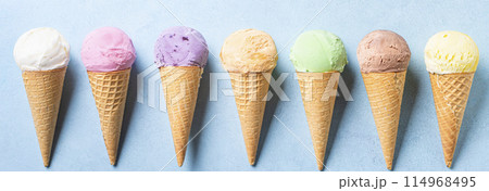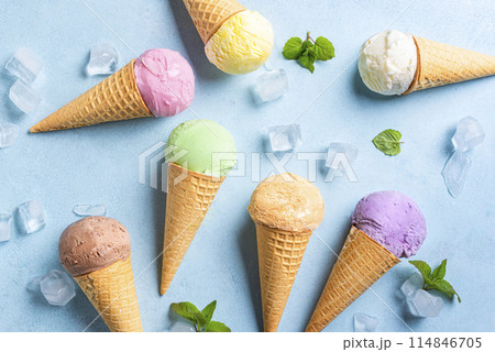 Coconut ice cream flavours in half of coconut setup on white stone background. Summer and Sweet menu concept.