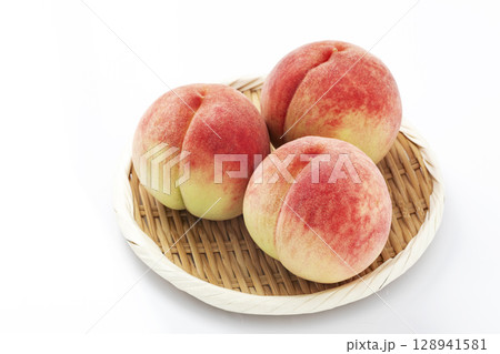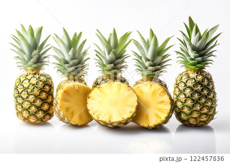 Two halves of passiflora edulis or passion fruit placed on green leaves against a white background