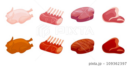 Fried bbq meat. Party food, seasonal raw and cooked meats slices. Steakhouse menu ingredients, cartoon isolated fresh foods neoteric vector set