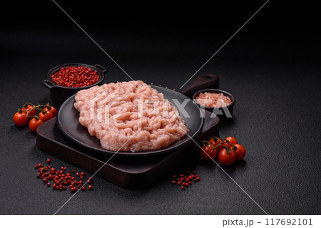 Raw steak with rosemary, basil, parsley, and mixed peppercorns in hand-drawn style on a white background. Concept of gourmet cooking