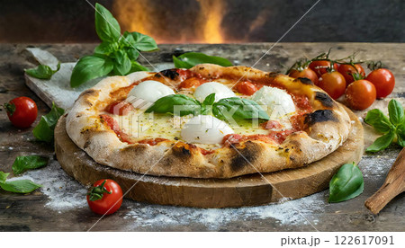 Margherita pizza with fresh basil, mozzarella, and cherry tomatoes on a rustic wooden plate