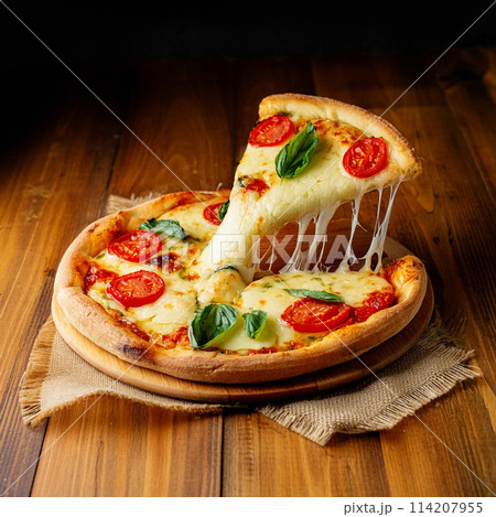 Classic Margherita pizza with fresh basil, tomatoes, and mozzarella on a wooden board