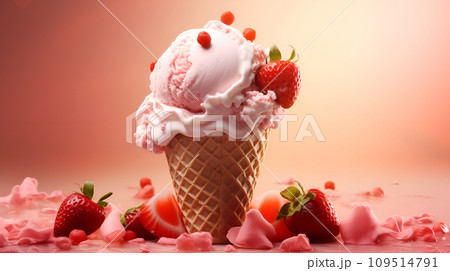 pink ice cream with strawberry in cone