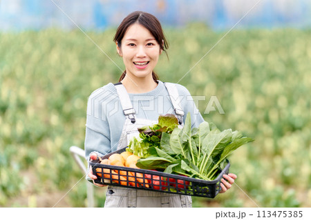一位年輕女子拿著新鮮蔬菜,微笑著
