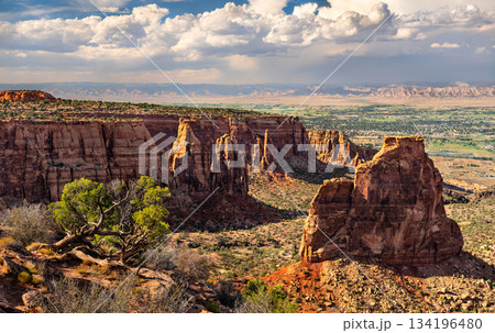 Scenic view from Grand View in Colorado National Monument. The Monument mesa is in the center, overlooking the Grand Valley and Book Cliffs under a dramatic cloudy sky