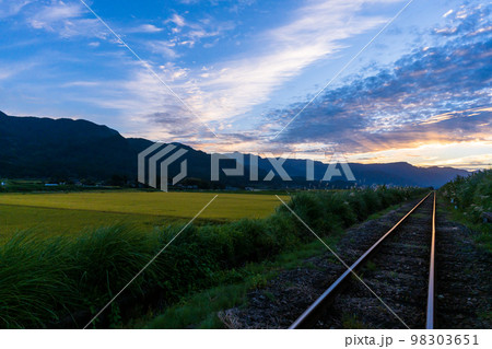 以鐵軌為背景的美麗夕陽和阿蘇群山的景色“南阿蘇白川水源站”
