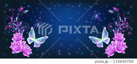 Delightful magical butterflies with pink roses on night sky background among shiny glowing sparkle stars in cosmic space. Love and romance concept.