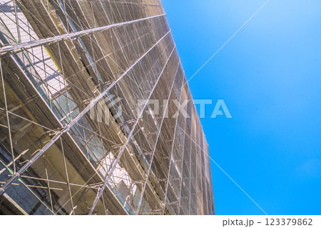 日本橫濱城市景觀 - 為維修和檢查公寓大樓而搭建的鷹架和防護網(橫濱市)