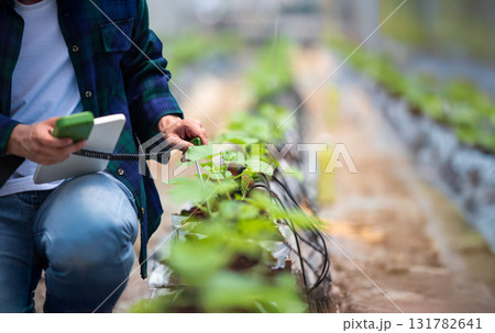 Farmer using tablet computer to monitor quality soil in melon farm