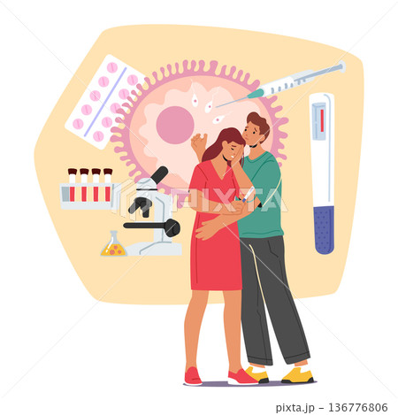 Artificial insemination. Tiny people with microscope and test tubes, gynecology doctor, In vitro fertilization, reproductive health diagnostic cartoon flat style isolated vector concept