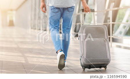 Time To Flight. Unrecognizable Man Walking With Suitcase In Airport, Going To Boarding Gate, Cropped Image, Rear View