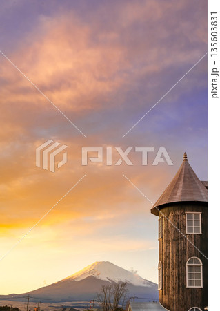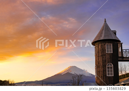 夕陽染紅的天空,白雪皚皚的富士山,以及一座古老的塔樓。