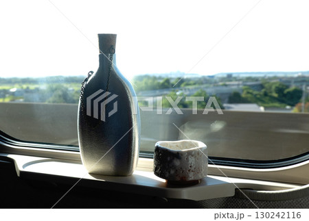 新潟縣柏崎市黃昏時分沿著海岸行駛的火車