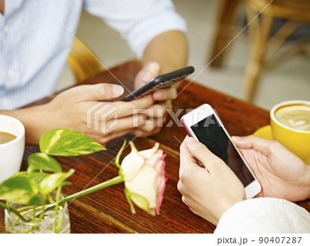 three happy beautiful young asian women sitting at table chatting talking in coffee shop or tea house