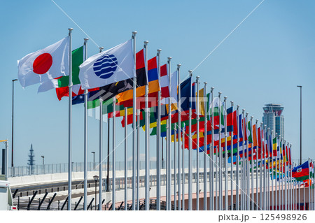 大阪關西世博會場入口處,各國國旗在藍天上飄揚