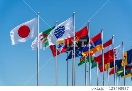 Many world's countries national flags waving together on the wind, with American, Japanese, Omani, Chinese, Russian, Somalian, Algerian banners in the foreground, Doha, Qatar