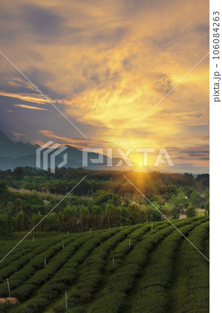 Vertical Green tea tree leaves field Fresh young tender bud herbal in farm on summer morning. Sunlight Green tea tree camellia sinensis in organic farm. Vertical Tree tea plant green nature farmland
