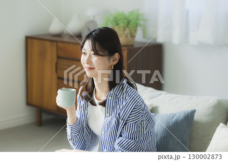 年輕女子在房間裡喝咖啡
