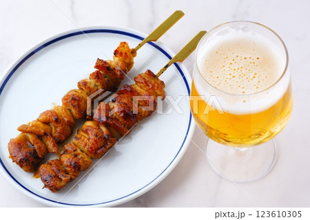 一邊喝啤酒,一邊吃著炭火烤製的帶醬汁的烤雞肉串(雞皮)。