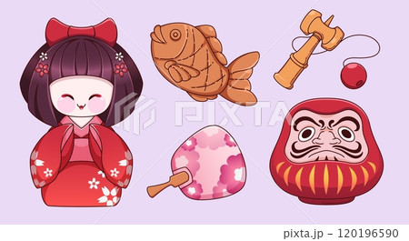 Japanese culture, tradition symbol, character and landmark isolated set, travel to Japan