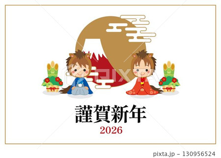 穿著外罩褲裙的男孩和穿著和服的女孩可愛地迎接新年