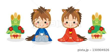 可愛的小男孩和小女孩迎接馬年的插圖。白色背景。套裝。向量。新年門松。