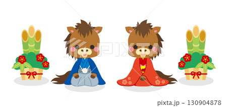 一匹穿著和服迎接新年的可愛馬的插圖。白色背景。集合。向量。新年。門松。