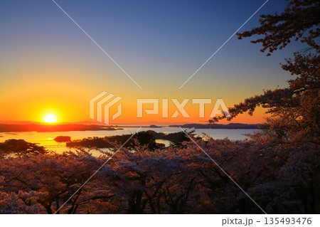 松島的櫻花飄落如雪。從西行毛都鬆公園眺望日本三景之一的松島,欣賞日出美景。