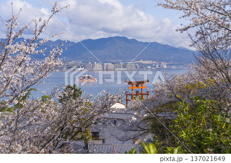 [廣島]盛開的櫻花和嚴島神社的大鳥居(宮島)