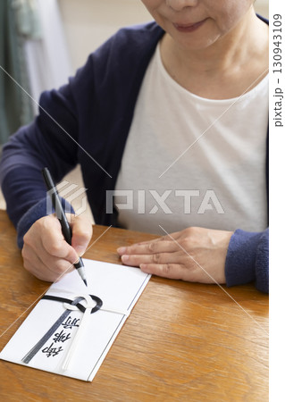 一位老年婦女用毛筆在弔唁信封上寫地址
