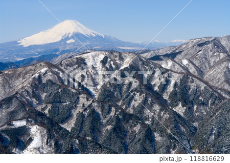 [山梨縣]積雪的荒山山仙根公園中瑞塔和富士山